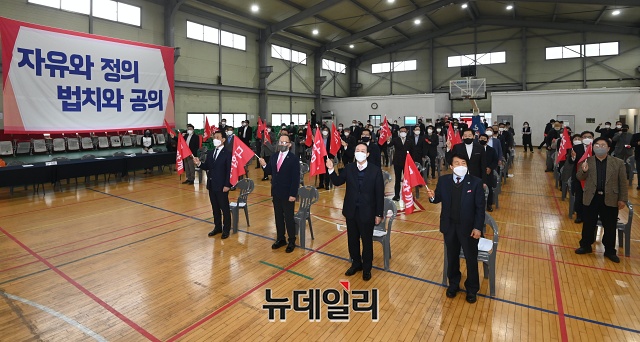 '윤석열을사랑하는모임(윤사모)' 회원들이 27일 오후 인천 미추홀구 국일정공 체육관에서 열린 '다함께자유당(가칭) 중앙당 창당발기인대회'에서 '다함께' '자유'라고 적힌 깃발을 흔드는 퍼포먼스를 하고 있다.