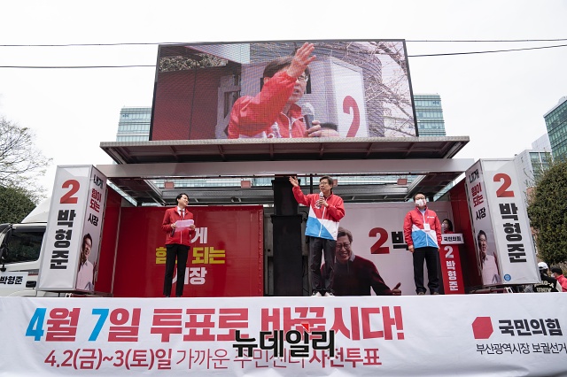 박형준 국민의힘 부산시장 후보가 27일 오후 부산 서구 부민교차로 인근에서 유세차량에 올라 지지호소를 하고 있다. (사진=박형준 캠프)