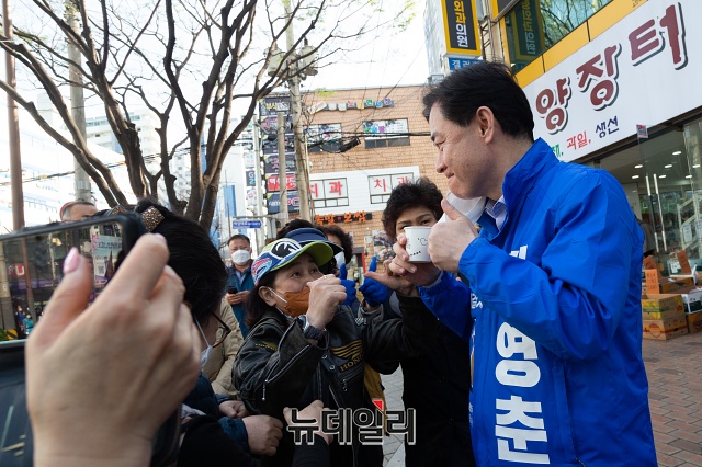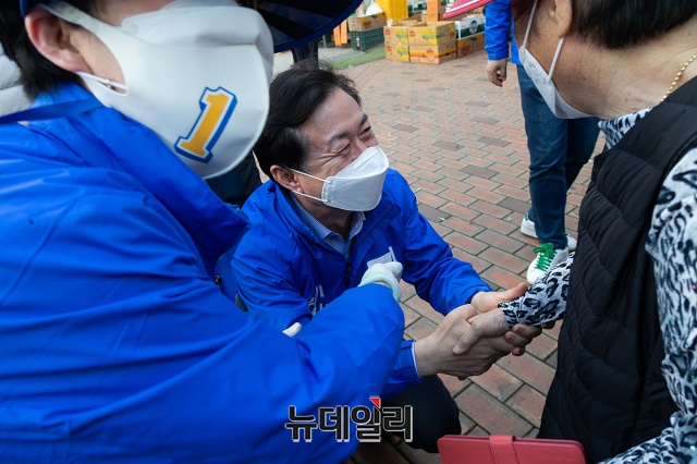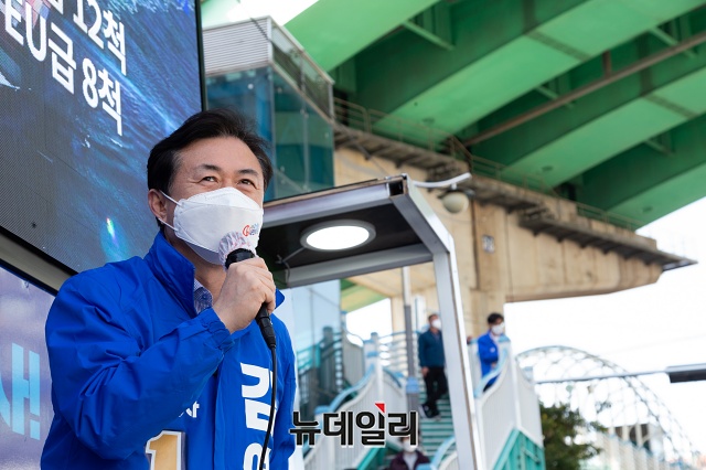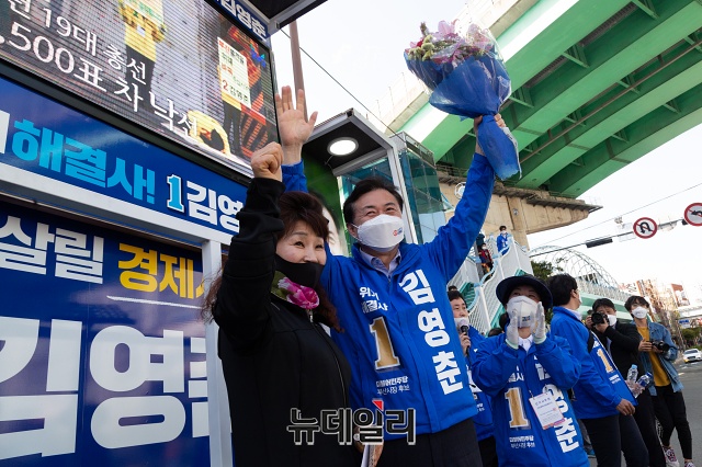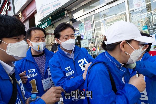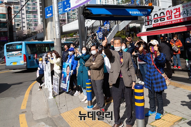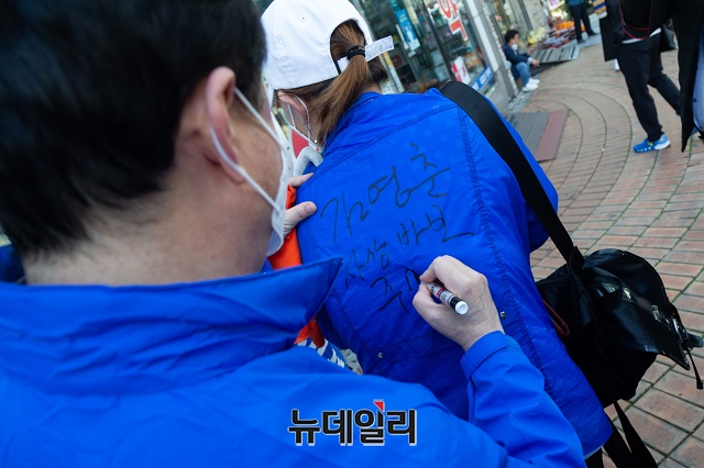 김영춘 더불어민주당 부산시장 후보가 28일 오후 부산 사상구 신모라 교차로 인근에서 열린 선거유세에서 지지자들에게 사인을 해주고 있다. (사진=김영춘 캠프)