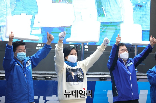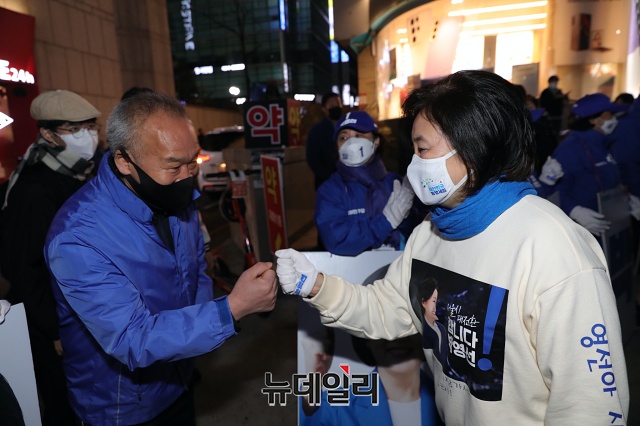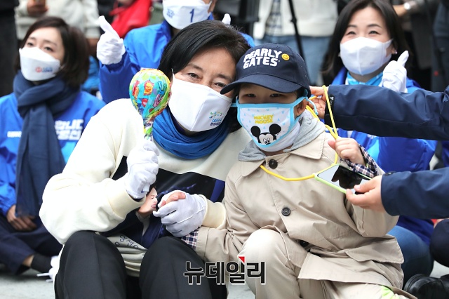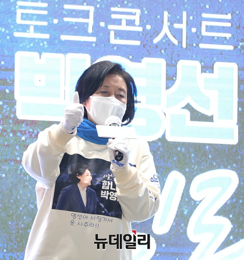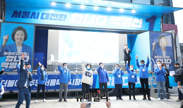 박영선 더불어민주당 서울시장 후보가 28일 오후 서울 서초구 강남역 인근에서 열린 거리유세에서 지지호소를 하고 있다. (사진=박영선 캠프)