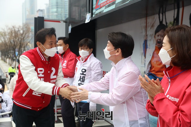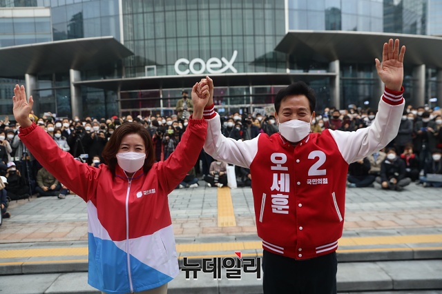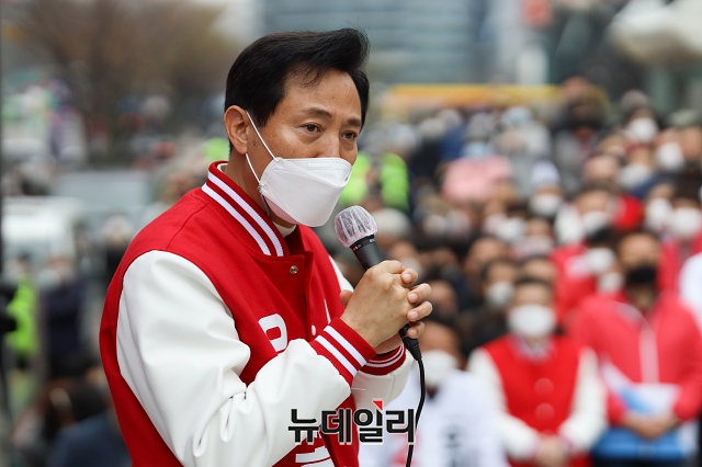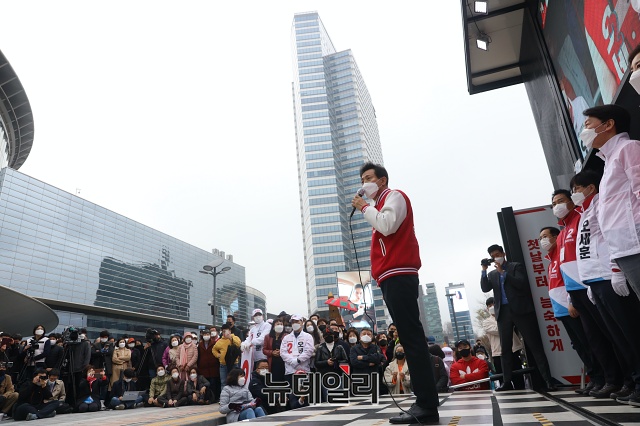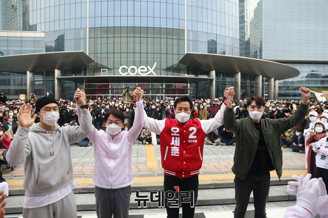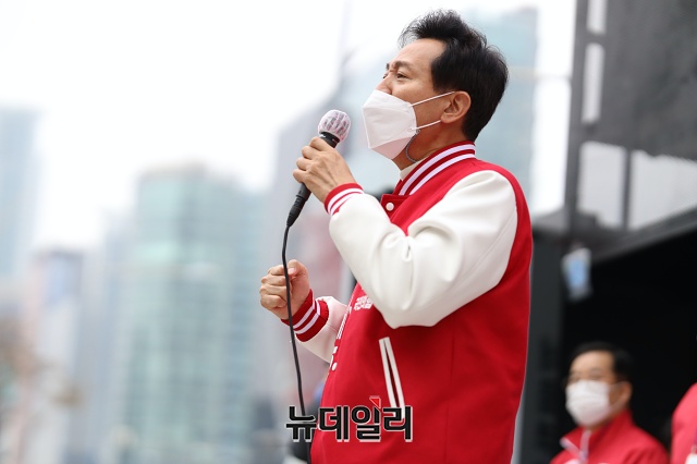 오세훈 국민의힘 서울시장 후보가 28일 오후 서울 강남구 코엑스 동문광장에서 지지호소를 하고 있다. (사진=오세훈 캠프)