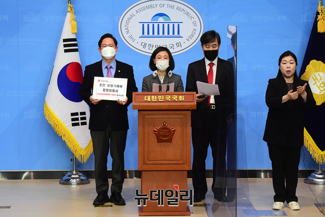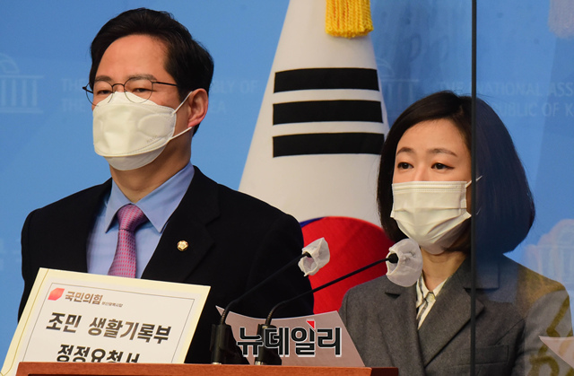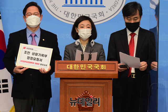 조민입학공정화특위위원장 황보승희 국민의힘 의원이 29일 오전 국회 소통관에서 "한영외고는 조민의 생활기록부를 당장 정정하라"며 기자회견을 갖고 있다.