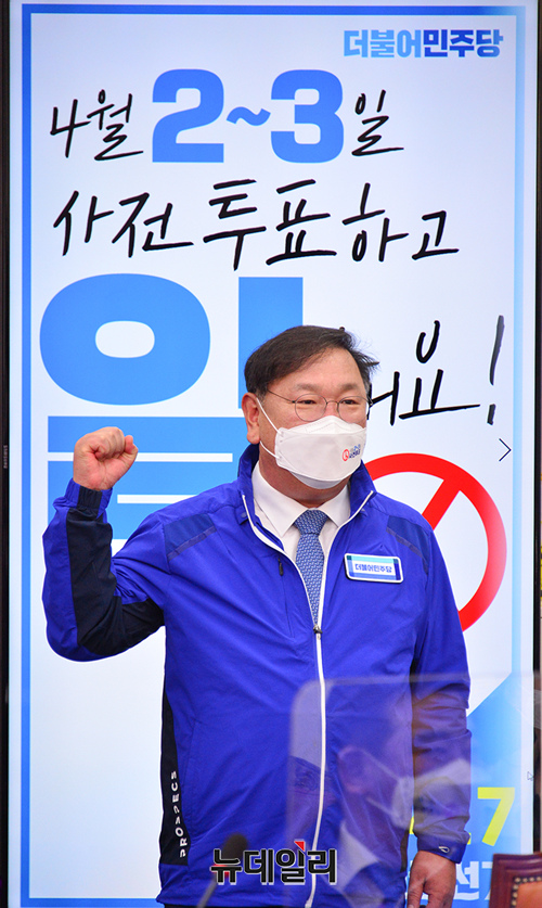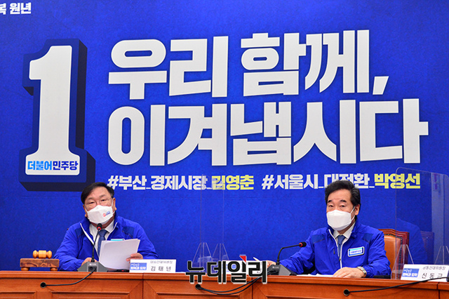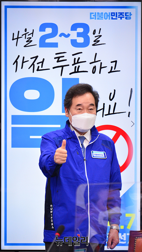 이낙연 더불어민주당 상임선대위원장과 김태년 당대표 직무대행이 29일 오전 국회에서 열린 중앙선대위회의에 참석하여 투표독려를 위해 퍼포먼스를 하고 있다. (사진=더불어민주당)