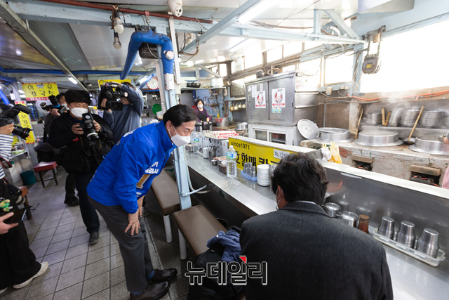 김영춘 더불어민주당 부산시장 후보가 29일 오후 부산 연제구 거제시장 앞에서 열린 '직장인과 함께하는 점심 집중유세'에서 시민들에게 지지를 호소하고 있다. (사진=김영춘캠프)