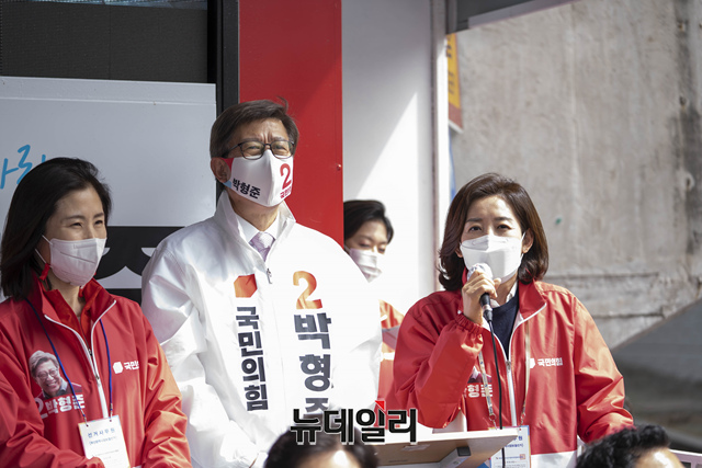 박형준 국민의힘 부산시장 후보가 29일 오후 부산 해운대구 반여동 아시아선수촌 아파트 인근에서 열린 유세에서 서병수, 김미희 의원, 나경원 전 의원 등과 함께 지지를 호소하고 있다. (사진=박형준캠프)