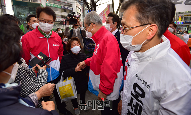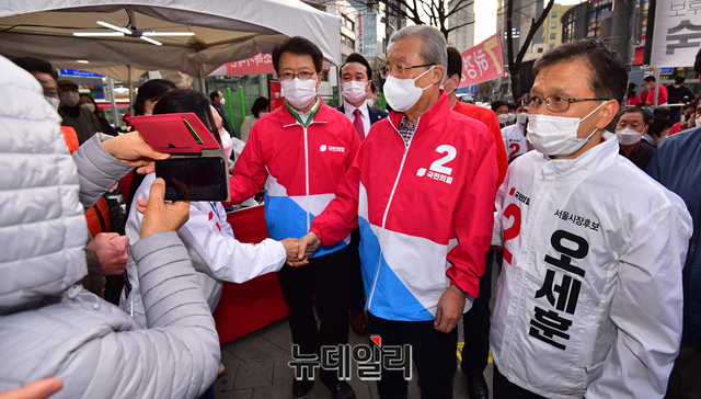 김종인 국민의힘 비상대책위원장이 29일 오후 서울 성북구 성신여대입구역에서 오세훈 서울시장 후보의 지원 유세를 마치고 시민들과 악수를 나누고 있다.