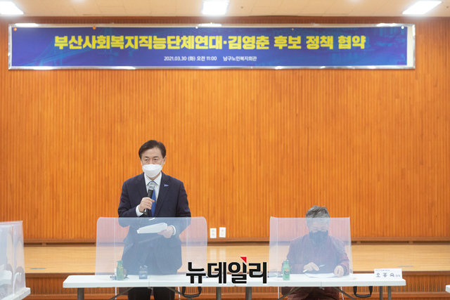 김영춘 더불어민주당 부산시장 후보가 30일 오전 부산 남구노인복지회관에서 열린 복지공약 발표 간담회 및 정책협약식 참석해 발언을 하고 있다. (사진=김영춘캠프)