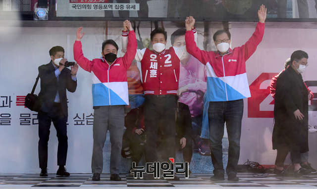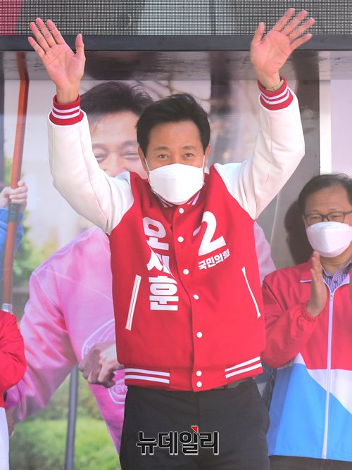 오세훈 국민의힘 서울시장 후보가 30일 오후 서울 영등포역 앞에서 열린 집중유세에서 시민들에게 지지를 호소하고 있다.