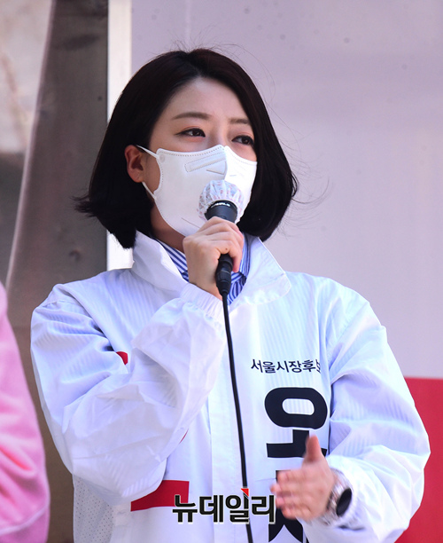 배현진 국민의힘 의원이 30일 오후 서울 영등포역 앞에서 열린 오세훈 서울시장 후보 집중유세에서 지지연설을 하고 있다.