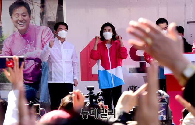 안철수 국민의당 대표와 나경원 국민의힘 전 의원이 30일 오후 서울 영등포역 앞에서 열린 오세훈 국민의힘 서울시장 후보 집중유세에 참석해 오 후보의 지지를 호소하고 있다.