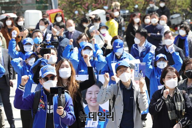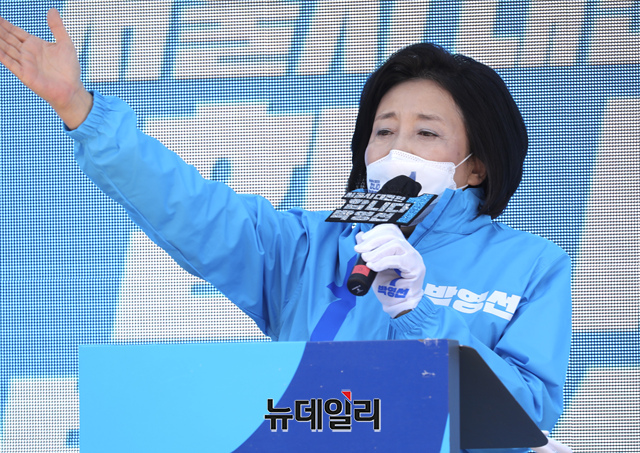 박영선 더불어민주당 서울시장 후보가 30일 서울 성동구 왕십리역 광장에서 집중유세에서 시민들에게 지지를 호소하고 있다. (사진=박영선캠프)