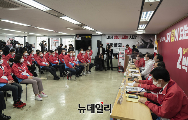 주호영 국민의힘 원내대표가 30일오전 부산 부산진구 박형준 부산시장 후보 선거사무소에서 열린 확대 원내대책회의에서 발언하고 있다. (사진=박형준캠프)