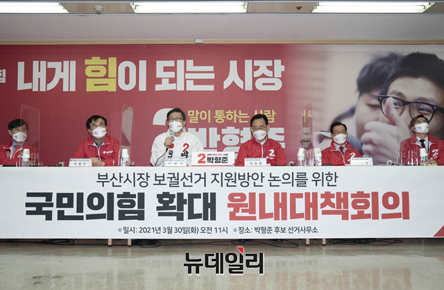 박형준 부산시장 후보가 30일 오전 부산 부산진구 본인의 선거사무소에서 열린 확대 원내대책회의에서 발언하고 있다. (사진=박형준캠프)