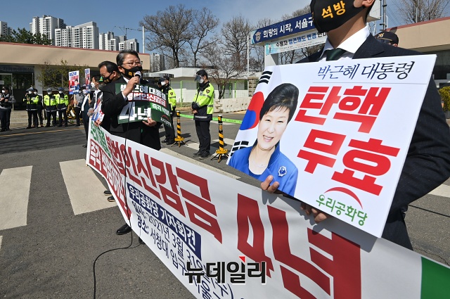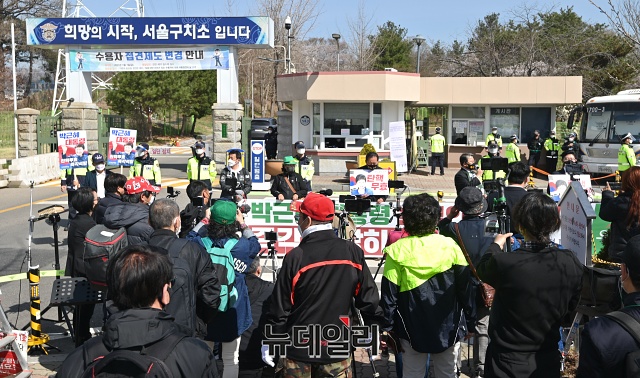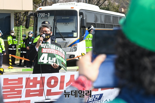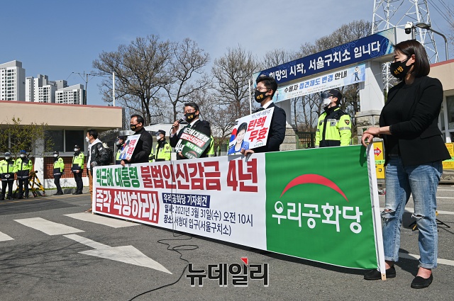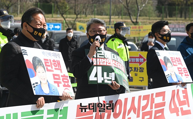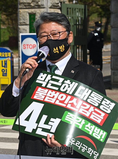조원진 우리공화당 대표가 31일 오전 경기 의왕시 서울구치소 앞에서 열린 박근혜 전 대통령 석방 촉구 기자회견에서 발언을 하고 있다.조 대표는 "4년 동안 죄없는 박근혜 대통령을 불법인신감금 시키는 문재인 좌파독재정권의 잔인한 정치보복은 즉각 멈춰야 한다"라며 "250만명이 넘는 국민이 박근혜 대통령 석방을 요구하는 서명에 동참한 것은 그만큼 민심이 석방을 원하고 있음을 보여주는 것"이라고 밝혔다.이날 오후에는 을지로입구역 인근에서 석방 촉구 집회를 이어갈 예정이다. (경기 의왕=권창회 기자)