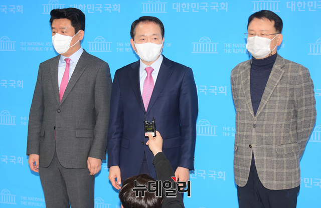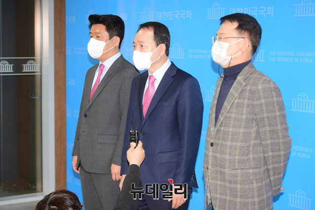 성일종 국민의힘 정무위원회 간사 및 소속의원들이 31일 오전 국회 소통관에서 이해충돌방지법 관련 기자회견을 마치고 기자들의 질문에 답하고 있다.