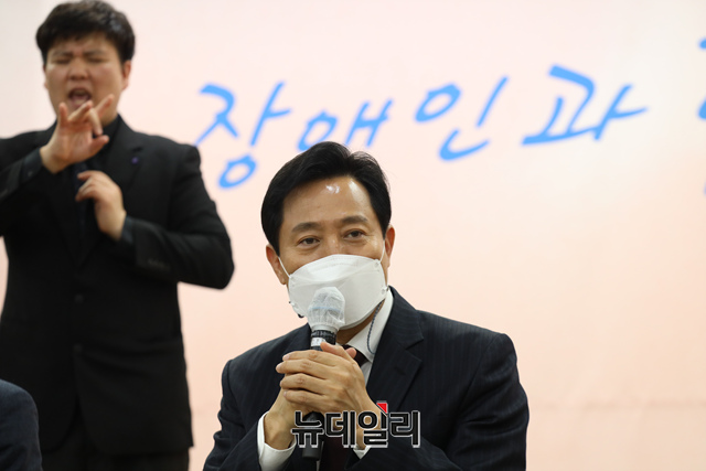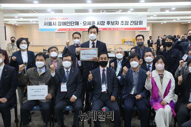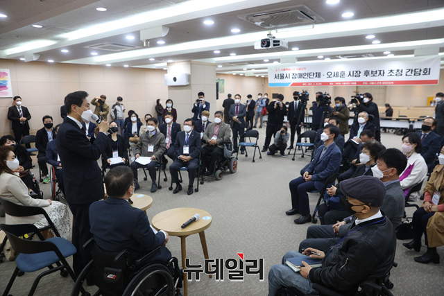 오세훈 서울시장 후보가 31일 오후 서울 여의도 이룸센터를 방문해 서울지역 장애인단체와 간담회를 갖고 있다. (사진=오세훈캠프)