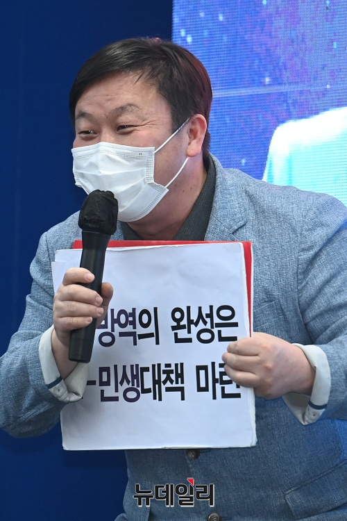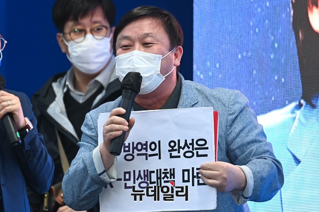 안진걸 민생경제연구소장이 31일 오후 서울 관악구 서울대입구역 인근에서 열린 ‘박영선의 힐링캠프’ 유세에서 인사말을 하고 있다.