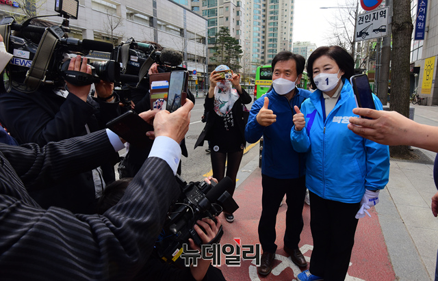 박영선 더불어민주당 서울시장 후보가 1일 서울 양천구 목동오거리에서 열린 집중유세에 앞서 시민들을 만나 지지를 호소하고 있다.