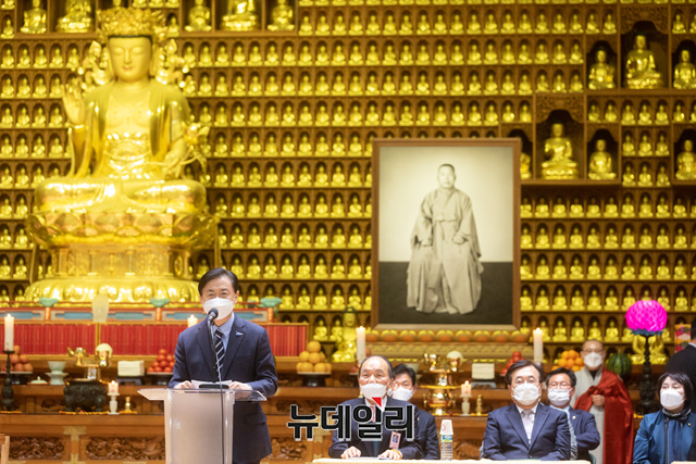 김영춘 더불어민주당 부산시장 후보가 1일 오전 부산진구 삼광사 정기법회에 참석해 발언을 하고 있다. (사진=김영춘캠프)