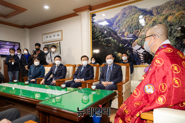 김영춘 더불어민주당 부산시장 후보가 1일 오전 부산진구 삼광사를 찾아 영제 주지스님과 대화를 나누고 있다. (사진=김영춘캠프)