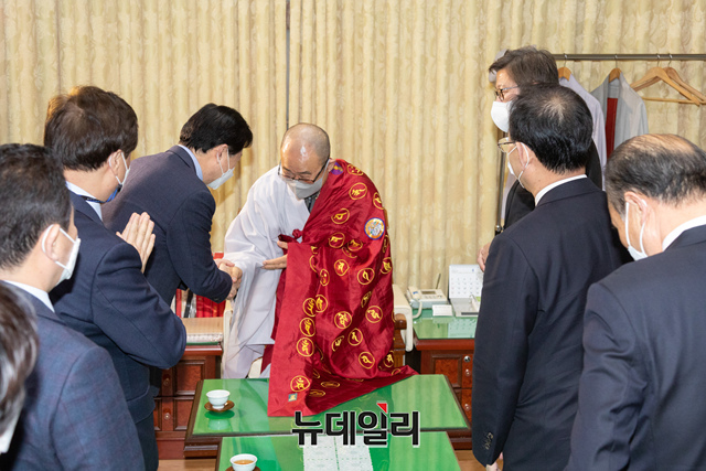 [포토] 영제스님과 대화 나누는 김영춘 후보