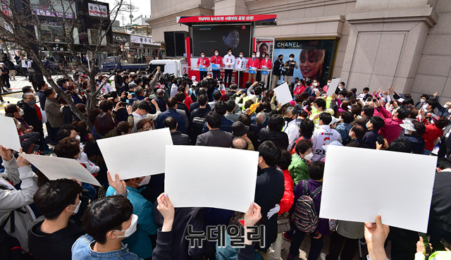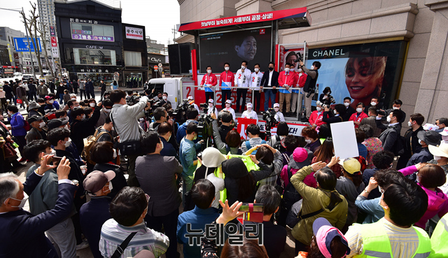 오세훈 국민의힘 서울시장 후보가 1일 오후 서울 성북구 현대백화점 앞에서 열린 유세에서 차량에 올라 지지호소를 하고 있다.