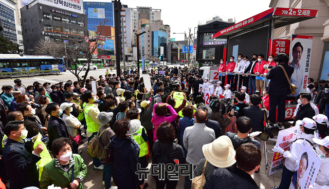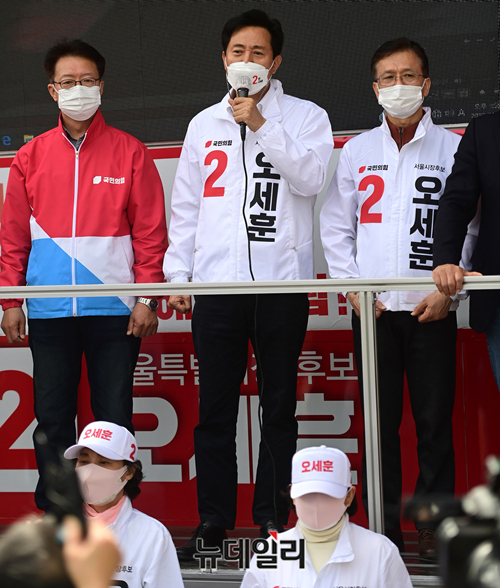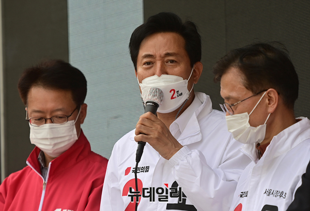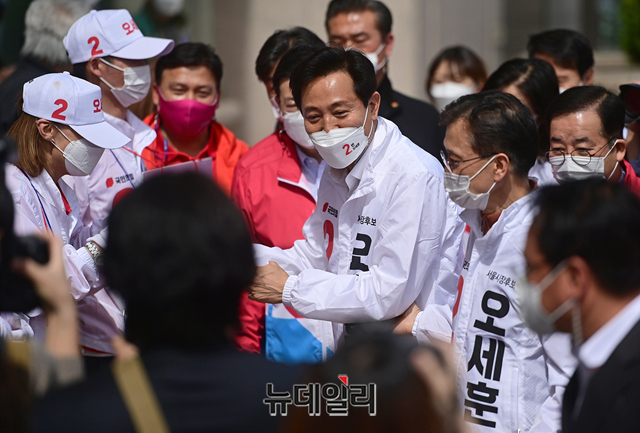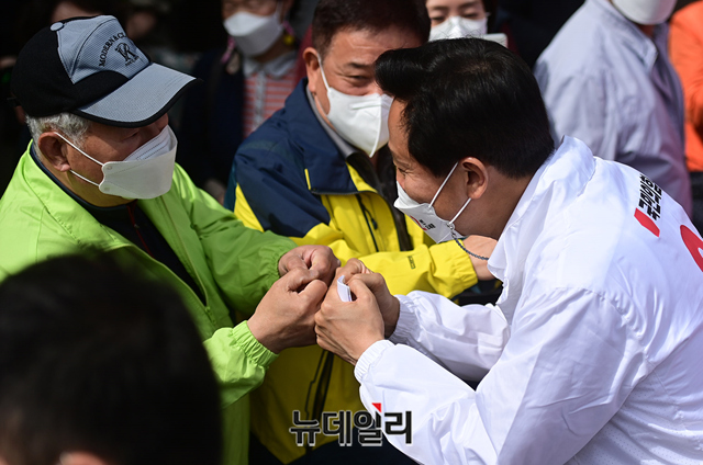 오세훈 국민의힘 서울시장 후보가 1일 오후 서울 성북구 현대백화점 앞에서 열린 유세장에 입장하며 유세원과 주먹인사를 나누고 있다.