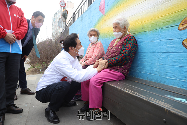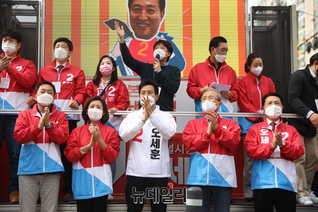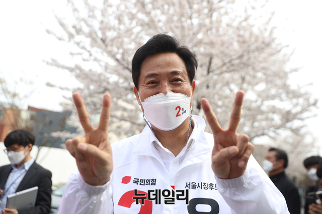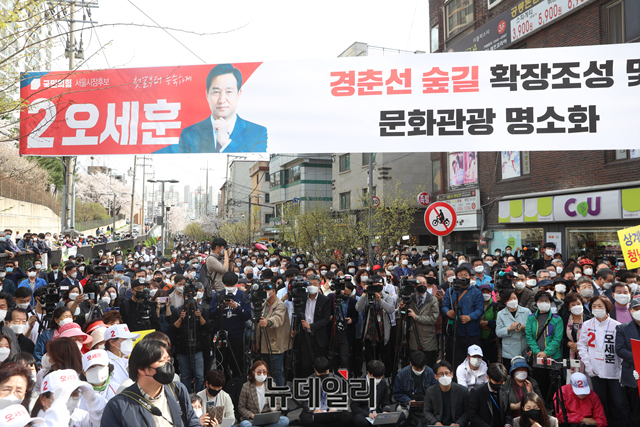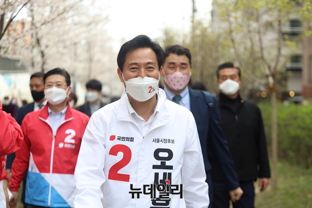 오세훈 국민의힘 서울시장 후보가 1일 오후 서울 노원구 경춘선숲길을 찾아 시민들과 악수를 나누고 있다. (사진=오세훈캠프)
