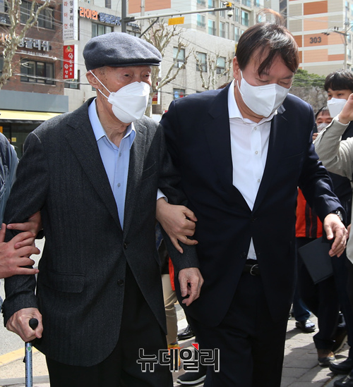 윤석열 전 검찰총장이 아버지 윤기중 연세대 명예교수를 모시고 2일 오전 서울 서대문구 남가좌1동 주민센터에 마련된 사전투표소로 들어가고 있다.