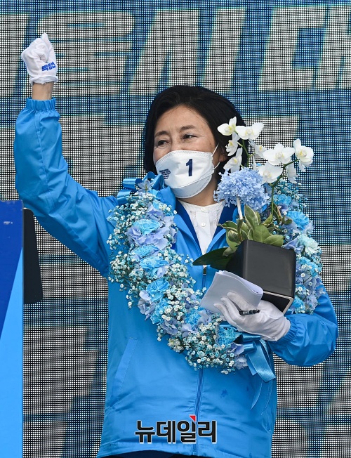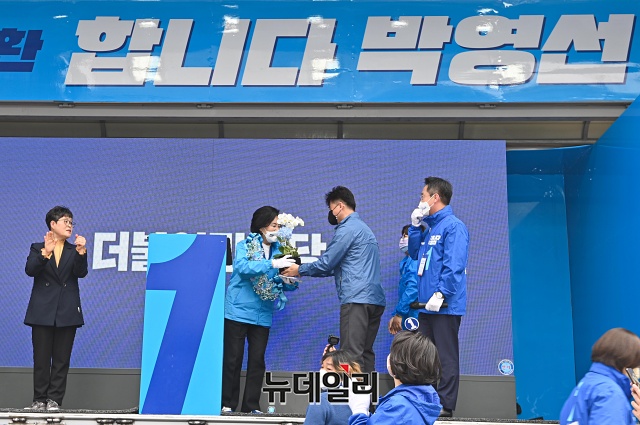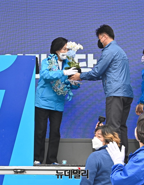 박영선 더불어민주당 서울시장 후보가 2일 오후 서울 중구 남대문시장에서 열린 집중유세에서 꽃다발을 받고 지지자들에게 인사하고 있다.