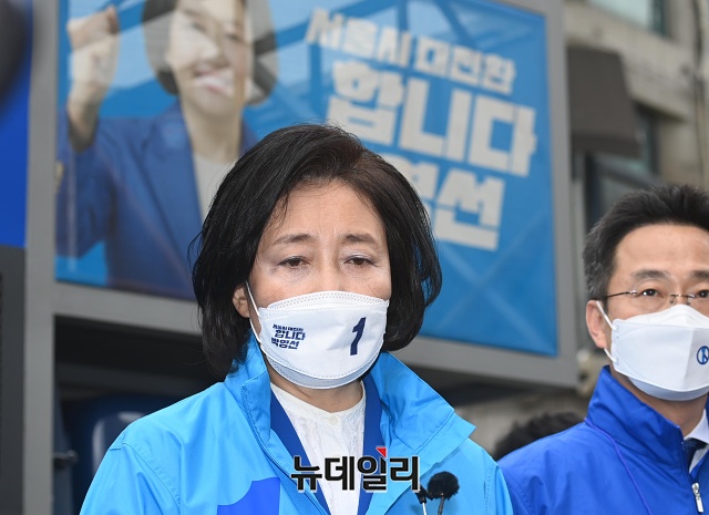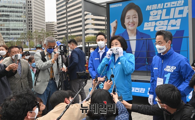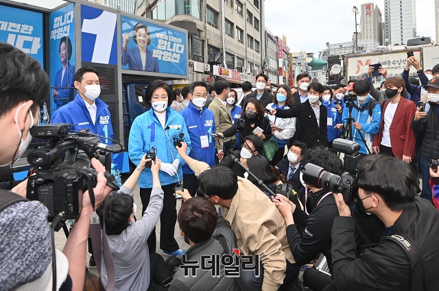 박영선 더불어민주당 서울시장 후보가 2일 오후 서울 중구 남대문시장에서 열린 집중유세를 마치고 취재진 질문에 답하고 있다.