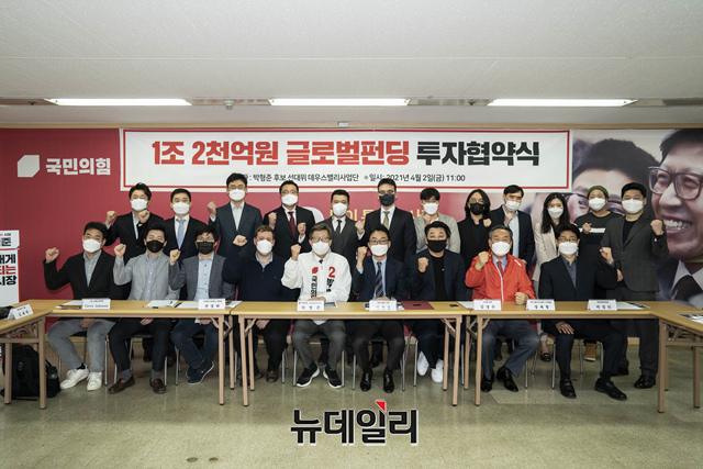 박형준 국민의힘 부산시장 후보가 2일 부산 부산진구 선대위 캠프에서 데우스 밸리 사업단과 1조2천억 글로벌투자 협약식을 맺고 있다. (사진=박형준캠프)