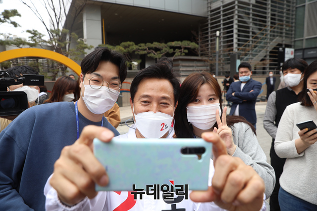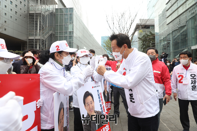 오세훈 국민의힘 서울시장 후보가 2일 오후 서울 마포구 상암동DMC에서 시민들을 만나 지지를 호소하고 있다.(사진=오세훈캠프)