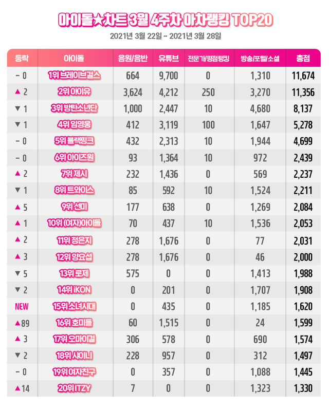 롤린(Rollin')으로 음원 차트 역주행 신화를 써 내려가고 있는 걸그룹 브레이브걸스가 3월 4주차 아이돌차트 아차랭킹 1위에 올랐다.브레이브걸스는 1일 발표된 아이돌차트 3월 4주차(3월 22~28일) 아차랭킹에서 음원점수 664점, 유튜브 점수 9700점, 소셜점수 1310점 등 총점 1만1674점을 얻어 1위를 기록했다.브레이브걸스는 4년 전 발매한 '롤린'이 뒤늦게 화제를 모으면서 음원 차트 1위에 오르는 등 역주행의 아이콘으로 떠올랐다.2위는 총점 1만1356점을 얻은 아이유가 차지했다. 뒤를 이어 방탄소년단(총점 8137점), 임영웅(총점 5278점), 블랙핑크(총점 4699점), 아이즈원(총점 2439점), 제시(총점 2237점), 트와이스(총점 2211점), 선미(총점 2084점), (여자)아이들(총점 2053점) 순으로 집계됐다.