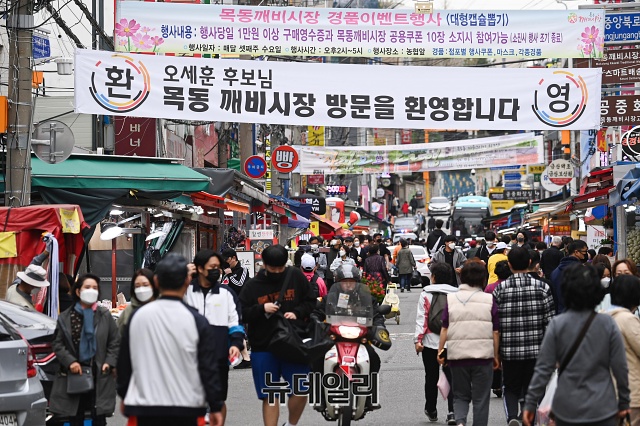 서울 양천구 목동깨비시장에 2일 오후 오세훈 국민의힘 서울시장 후보 방문을 환영한다는 현수막이 걸려있다.