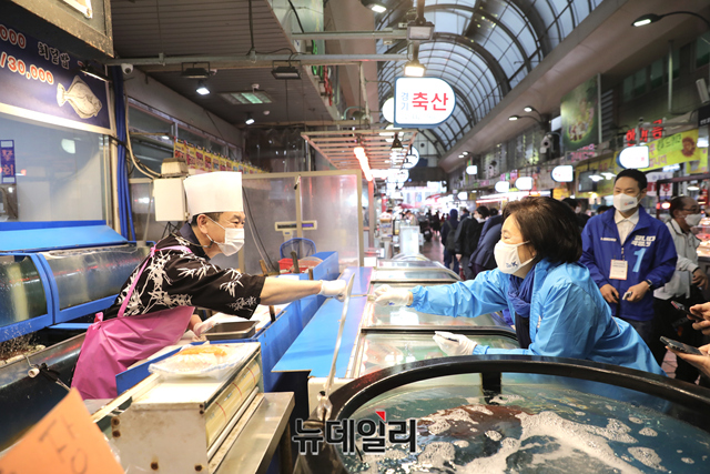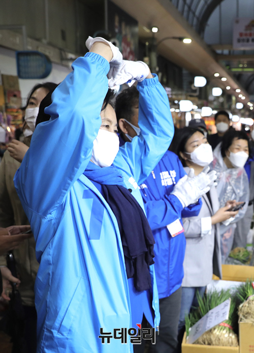박영선 더불어민주당 서울시장 후보가 3일 오후 서울 강동구 암사시장을 찾아 상인과 주먹인사를 나누고 있다. (사진=박영선캠프)