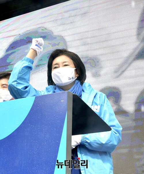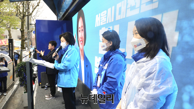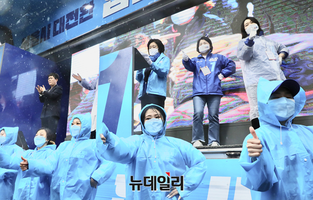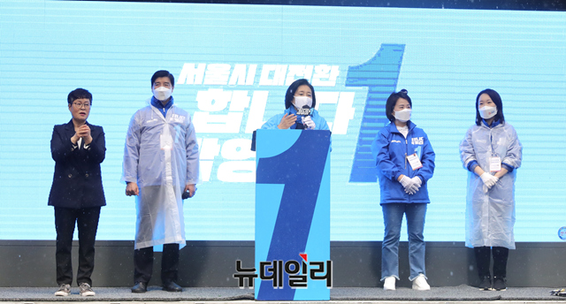 [포토] 봄비 내리는 주말, 강동구 찾은 박영선 후보