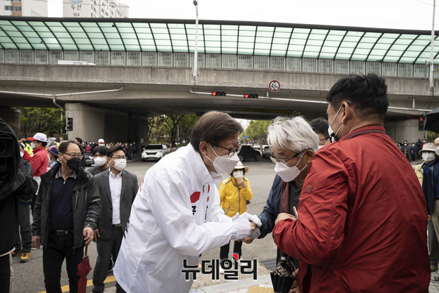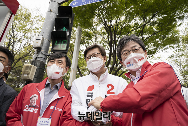 박형준 국민의힘 부산시장 후보가 3일 오후 부산 북구 구포시장을 찾아 유승민 공동선대위원장, 하태경 의원과 손을 맞잡고 지지호소를 하고 있다. (사진=박형준캠프)