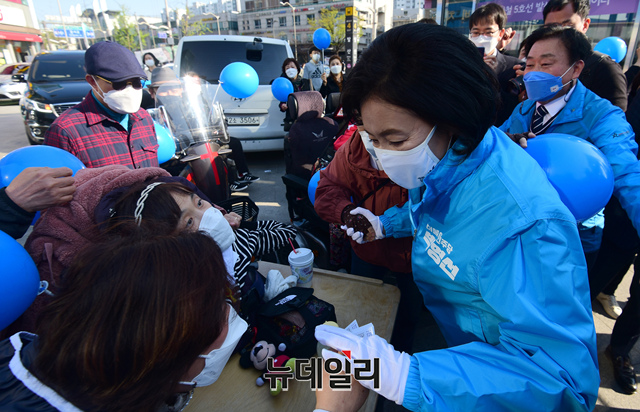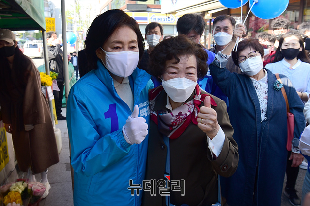 박영선 더불어민주당 서울시장 후보가 5일 서울 강서구 내발산동 발산역 사거리 열린 유세에서 지지를 호소하고 있다.
