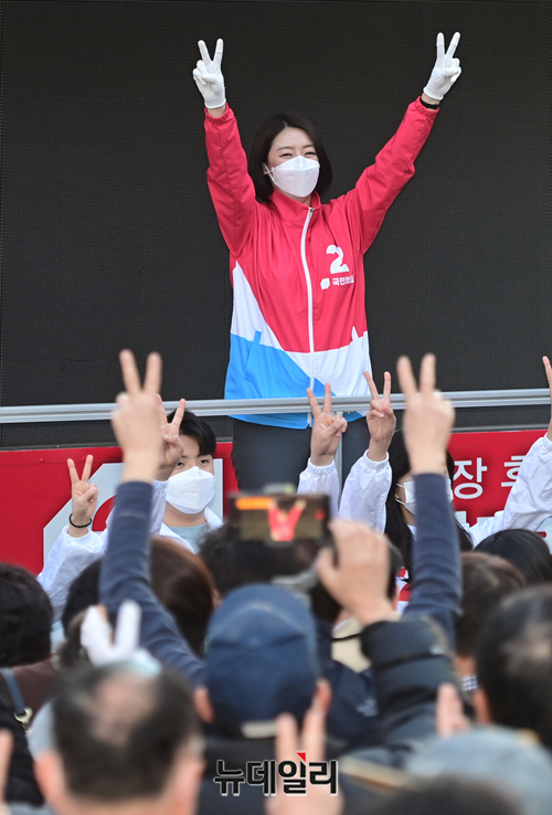 배현진 국민의힘 의원이 5일 오후 서울 송파구 잠실주공 5단지 앞에서 열린 오세훈 서울시장 후보 유세에서 차량에 올라 지지호소를 하고 있다.