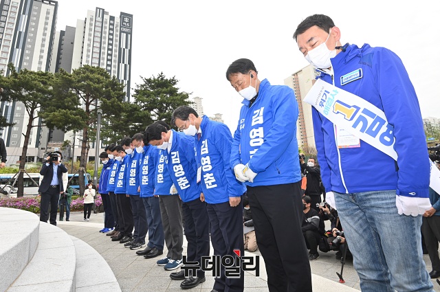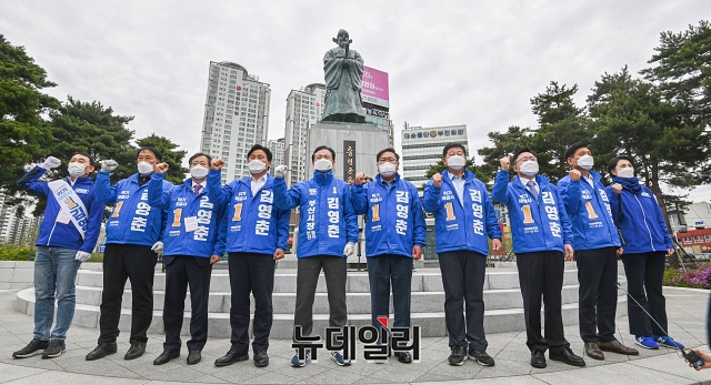 김영춘 더불어민주당 부산시장 후보, 김태년 당대표 직무대행을 비롯한 원내대표단이 6일 오전 부산 부산진구 송상현 동상에서 열린 '김영춘 승리의길 출정식'에 앞서 참배를 하고 있다. (부산=권창회 기자)