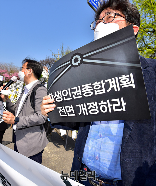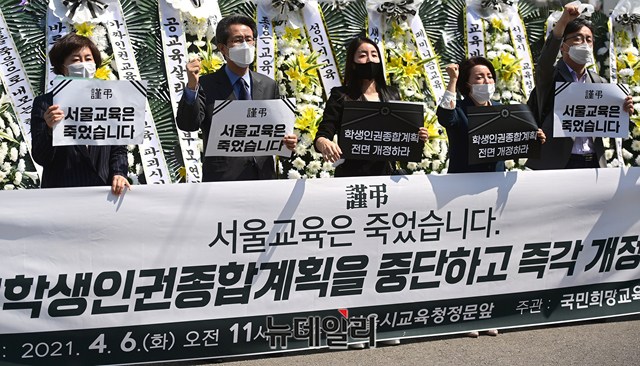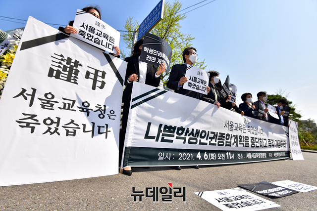 국민희망교육연대가 6일 오전 서울 종로구 서울교육청 앞에서 학생인권종합계획 중단과 개정을 촉구하는 기자회견을 갖고 있다.