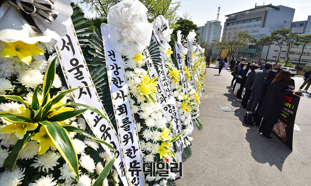 [포토] 서울교육청에 늘어선 근조화환 "학생인권종합계획 중단하라"