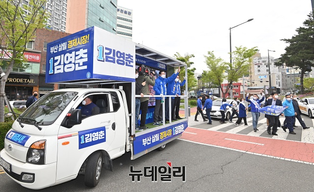 김영춘 더불어민주당 부산시장 후보가 6일 오전 부산 부산진구 송상현 동상 인근에서 유세차량에 올라 지지자들과 인사하고 있다. (부산=권창회 기자)