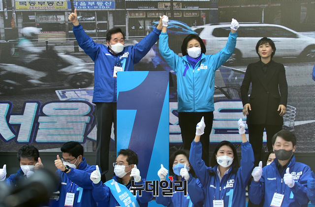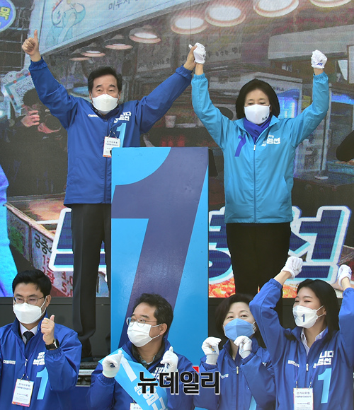 박영선 더불어민주당 서울시장 후보와 이낙연 상임선대위원장이 6일 서울 종로구 동화면세점 열린 광화문 집중유세에서 지지를 호소하고 있다.
