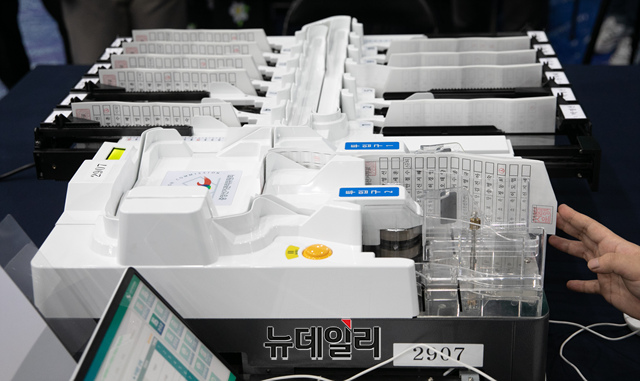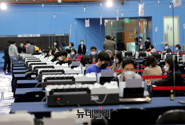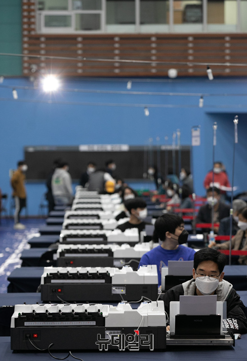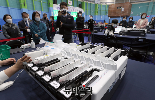 4.7 보궐선거를 하루 앞둔 6일 오후 서울 양천구 신정로 계남다목적체육관에서 선관위 관계자와 개표사무원들이 투표지분류기를 최종 모의시험하고 있다.
