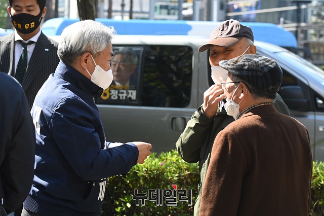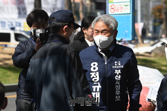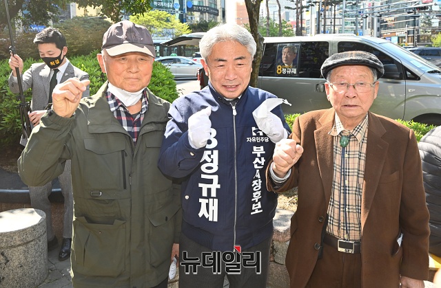 정규재 자유민주당 부산시장 후보가 6일 오후 부산 부산진구 서면교차로 인근에서 지지자들과 기념촬영을 하고 있다. (부산=권창회 기자)