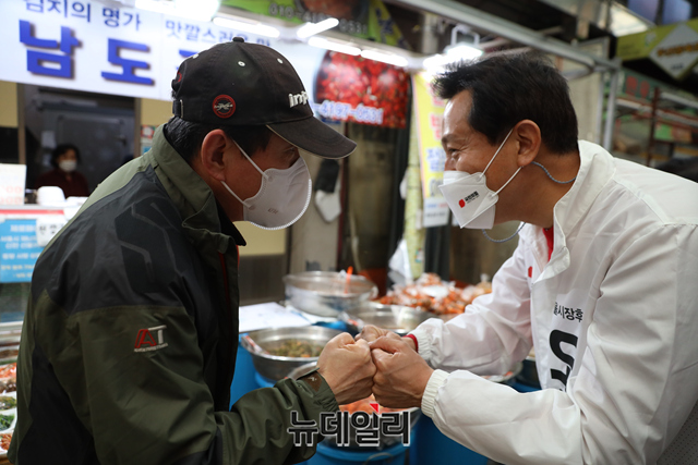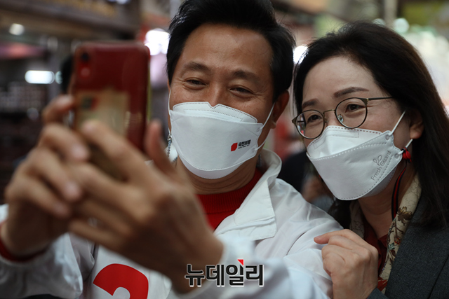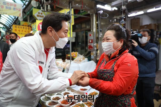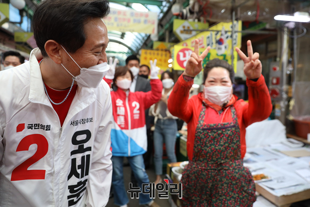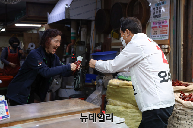 오세훈 국민의힘 서울시장 후보가 선거운동 마지막 날인 6일 오전 서울 중랑구 골목유세에서 시민들과 인사를 나누고 있다. (사진=오세훈캠프)