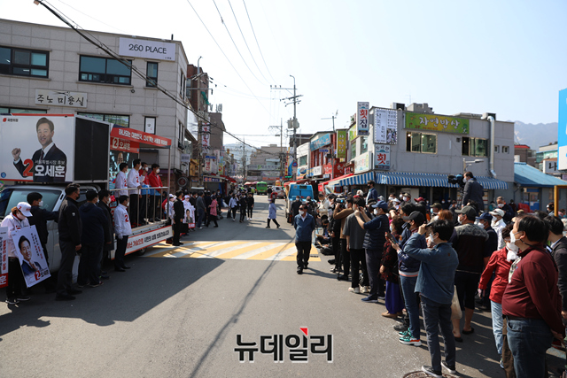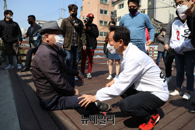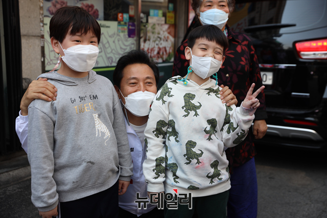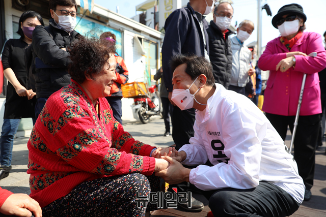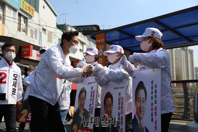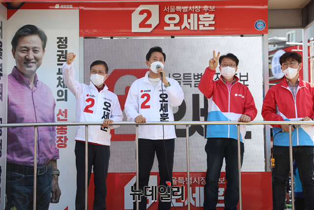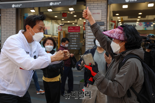 오세훈 국민의힘 서울시장 후보가 선거운동 마지막 날인 6일 오후 서울 성북구 정릉 골목유세에서 한상학 성북갑 당협위원장과 손을 잡고 지지호소를 하고 있다. (사진=오세훈캠프)