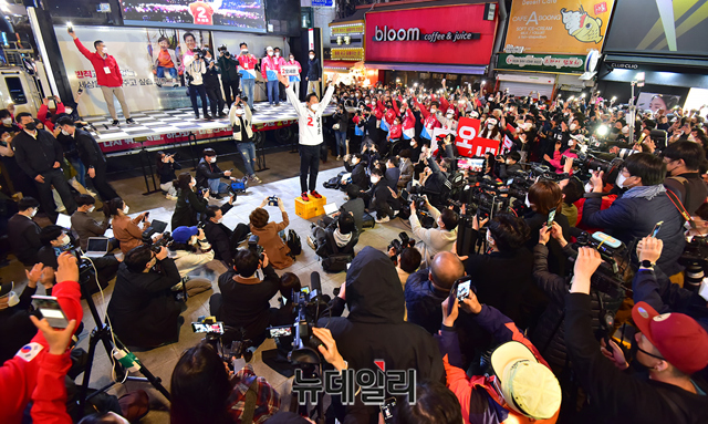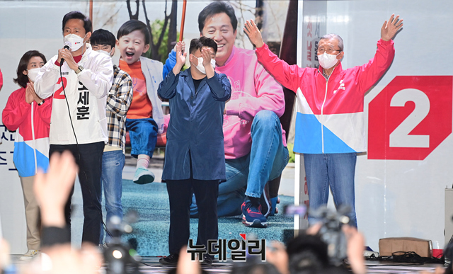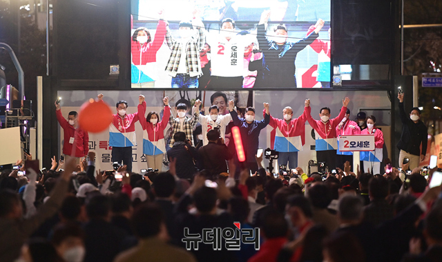 오세훈 국민의힘 서울시장 후보가 선거유세 마지막 날인 6일 오후 서울 서대문구 신촌에서 파이널 유세를 갖고 있다.